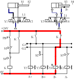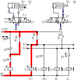 [Note: The electro-pneumatic circuits below are extracted from the textbook on ‘Electro-pneumatics and Automation’ authored by Joji Parambath. For the explanation of solution in cascade method for this control task and more complicated electro-pneumatic circuits, please refer to the textbook.]