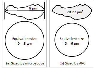 - By using automatic particle counters (APCs) calibrated as per ISO 11171, where the particles are sized by the area rather than the length. [See Figure 1(b)]