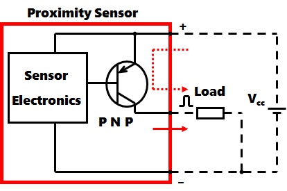 The sourcing output sensor has a PNP transistor output with its emitter connected to the +Vcc of the supply for positive switching, as shown in Figure 1. The load is connected between the proximity sensor output and the negative potential. This connection means that the sensor output will be pulled up to the positive potential, and hence the grounded load will be connected to the positive potential through the transistor in the switched state. This connection will allow the current to flow from the positive potential through the sensor to the output (hence sourcing). This sensor is best selected when all electrical devices in the control system use a single source of the supply voltage.