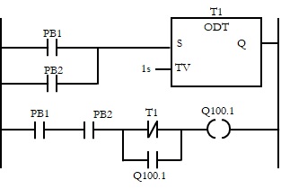 The pushbuttons must be pressed within a short time, say one second, to get the anti-tie-down feature. A ladder program to implement this control requirement by taking a lamp (Q100.1) as the representative output device.