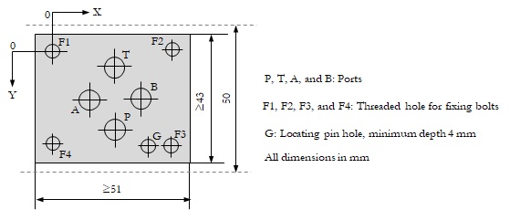 Figure 3 gives the locations, pattern of ports, and holes for mounting bolts and locating pins on the mounting surface of a sub-plate for size 03 as per ISO 4401 [NFPA D03, CETOP 3, or NG 6] without pilot ports.