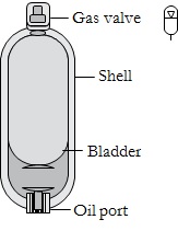 A bladder accumulator consists of a seamless cylindrical pressure vessel (shell), internal elastomeric bladder, poppet valve, fluid (oil) port, charging valve, and clamps and brackets. A schematic diagram of a bladder accumulator is shown in the figure below and the basic constructional features and specification parameters are highlighted in the subsequent sections.