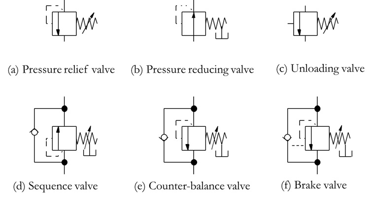 According to their function in hydraulic circuits, pressure regulating and control valves can be categorized into many basic types. They are (1) pressure relief valves, (2) pressure reducing valves, (3) unloading valves, (4) sequence valves, (5) counterbalance valves, and (6) brake valves. The symbolic representations of these valves are given in Figure 1.
