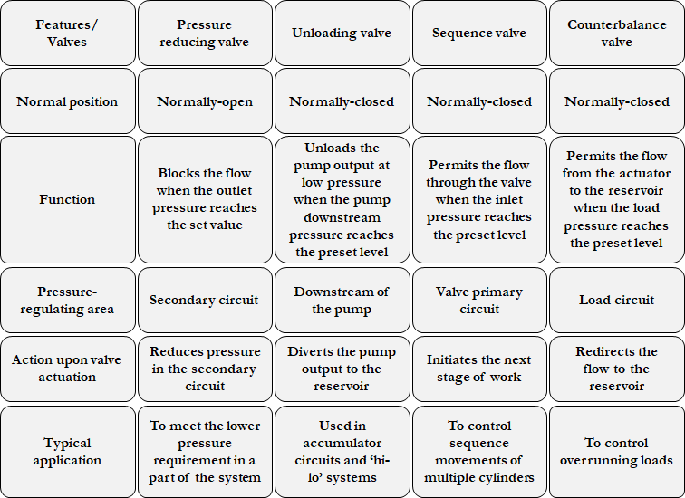 A basic comparison of some of the pressure control valves is highlighted below, in a most generalized way.